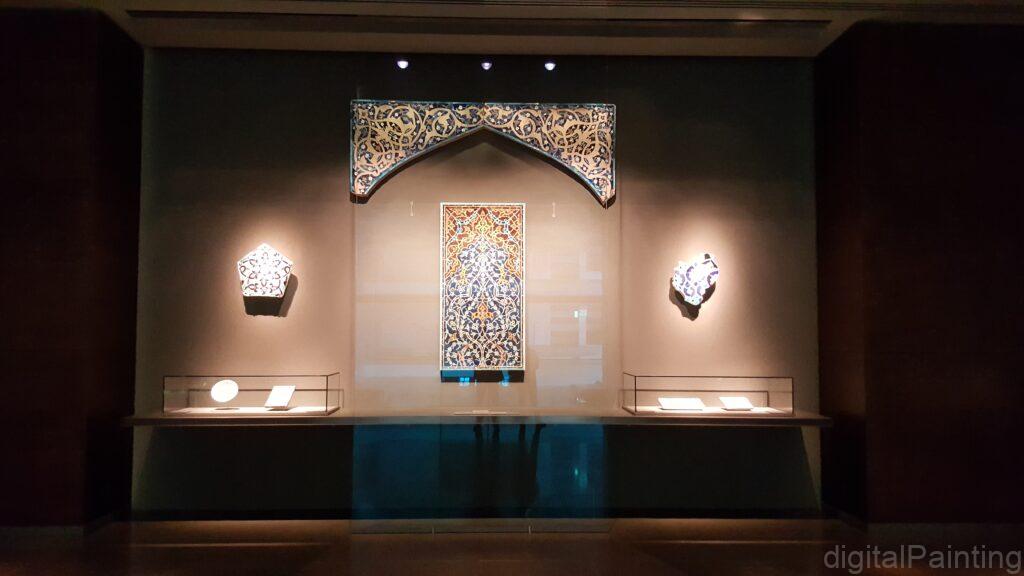 Mein heutiges Bild entstammt von weiter her, aus dem Land Katar, der Hauptstadt Doha und da aus einem schlichten weißen, aber sehr edel und modern wirkenden Gebäude das erhaben auf einem Hügel am Persischen Golf steht. Wir befinden uns im Museum für Islamische Kunst. Nun werden ein paar braune Geister vielleicht sagen:“ Islam, Terrorismus, Mittelalter“, nein im Islam wurde schon der Wissenschaft und Kunst einen hohen Stellenwert eingeräumt da saß der Germane noch auf dem Baum und knackte Flöhe. Allein schon der Weg dahin ist ein Erlebnis (wenn man von den Temperaturen und der hohen Luftfeuchtigkeit absieht“). Auf einer künstlichen Halbinsel gelegen, ein Weg aus perfekt geformten Steinplatten, gesäumt von Palmen die dem halb im Delirium sich befindenden Europäer ein bisschen Linderung verschaffen. Dann betritt man das Gebäude und es macht „BÄMM!!“, man fühlt sich schockgefrostet, muss aber erstmal durch eine Securityschleuse bevor der Weg frei ist. Die Exponate befinden sich auf mehreren Ebenen die geformt sind wie der Saal Wiener Staatsoper, während die Bühne den Blick nach draussen freigibt auf das moderne Doha mit seinem Skyscrapern. Die Darbietung der Exponate an sich ist schlicht, in hohen bis zu Decke reichenden Cuben aus Panzerglas, dunklen Räumen, erhellt ist nur das Exponat. Es befinden sich da Ausgaben vom Koran die 1000 Jahre alt sind, verziert mit feinster Kalligraphie aus Gold, Silber und Tinte. Und da befindet sich mein heutiges Bild, ein Traum aus der Schlichtheit der stilisierten islamischen Arabeske , flankiert links und rechts Pattern von Girih-Kacheln .